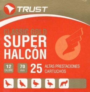 Cartucho Trust Super Halcon 36 gramos, el más rápido y potente de la marca Trust. Calibre 12 de 70mm con 405 m/s de velocidad, diseñado para caza en llano y tiro a larga distancia. Munición BB Copper Plated con taco plástico para máxima efectividad. Disponible en números 0, 5, 6 y 7.